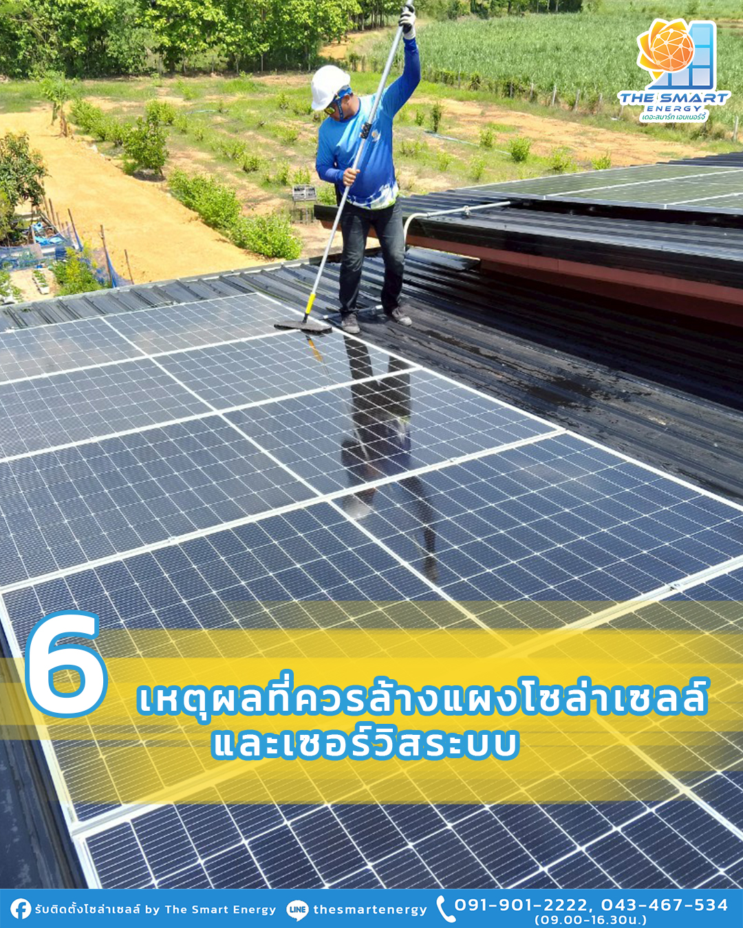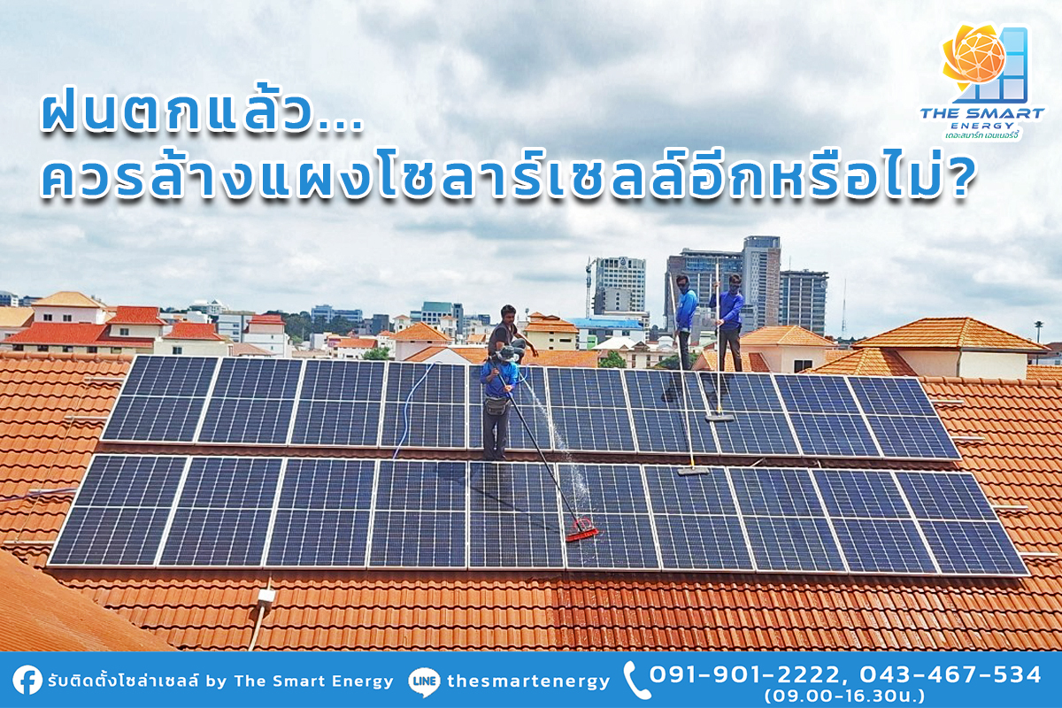 6 เหตุผลที่ควรล้างแผงโซล่าเซลล์.1. เพื่อเพิ่มประสิทธิภาพ. แผงโซล่าเซลล์ เมื่อถูกใช้ไปนานเข้าประสิทธิภาพก็จะลดลงไปตามอายุการใช้งาน แต่หากเราไม่ล้างแผงประสิทธิภาพก็จะลดลงยิ่งกว่านั้น จากการสำรวจสถิติพบว่า ประสิทธิภาพและคุณสมบัติของแผงจะได้รับการปรับปรุงอย่างต่อเนื่อง ซึ่งเพิ่มขึ้น 21% ในระดับครัวเรือน และเพิ่มขึ้น 60% ในระดับธุรกิจ. ดังนั้นในทางที่ดีเราจึงควรล้างแผงโซล่าเซลล์อย่างสม่ำเสมอ เพื่อประสิทธิภาพการผลิตพลังงานอย่างเต็มกำลัง.2.เงื่อนไขการรับประกัน. ผู้ผลิตแผงโซล่าเซลล์ส่วนใหญ่กำหนดให้ทำความสะอาดแผงเป็นประจำ ซึ่งบริการนี้จะมีอยู่ในการรับประกันอยู่แล้ว ดังนั้นเราไม่ควรเสียโอกาสการล้างแผงโซล่าเซลล์อย่างสม่ำเสมอจากบริษัทผู้ให้บริการ เพราะเมื่อหมดระยะเวลาประกันไปแล้ว เราจะไม่สามารถเรียกร้องสิทธิประโยชน์นี้ได้อีก.3.เพิ่มความทนทาน. การทำความสะอาดแผงโซล่าเซลล์ จะขจัดสิ่งสกปรก สารเคมี มูลนก และอื่นๆ โดยสิ่งสกปรกเหล่านี้อาจทำให้แผงโซล่าเซลล์เสื่อมประสิทธิภาพลง และอาจทำให้เกิดความเสียหายต่อแผงได้ง่ายขึ้น ซึ่งการรักษาความสะอาดจะช่วยยืดอายุการใช้งานของแผงโซล่าเซลล์ได้ในระดับหนึ่งเลยทีเดียว.4.เพิ่มโอกาสในการตรวจสอบเพิ่มเติม. เมื่อทำการล้างแผงโซล่าเซลล์ ก็เท่ากับว่าเราสามารถตรวจสอบความเสียหายได้ในเวลานี้ด้วย โดยถ้าหากเราพบความเสียหายตั้งแต่เนิ่นๆ ก็สามารถแก้ไขได้ในทันที แทนที่จะเสียค่าซ่อมแซมราคาแพง.5.ช่วยให้ระยะเวลาในการคืนทุนเร็วขึ้น. การลงทุน ติดตั้งโซล่าเซลล์ มีราคาค่อนข้างสูง ซึ่งผู้ลงทุนติดตั้งโซลาร์ฯ ส่วนมากก็มีความมุ่งหวังอยากจะให้การลงทุนนี้คืนทุนได้เร็วมากที่สุด แต่จากที่ทราบถ้าเราไม่ทำความสะอาดแผงโซล่าเซลล์ ประสิทธิภาพการผลิตพลังงานก็จะลดลง และทำให้ผลตอบแทนจากการลงทุน (ROI) ลดลงเช่นกัน ดังนั้นเราควรล้างแผงโซล่าเซลล์อย่างสม่ำเสมอนั่นเอง.6.ฝนไม่ได้ช่วยทำความสะอาด. หลายคนอาจคิดว่าน้ำฝนจะช่วยทำความสะอาดหรือล้างแผงโซล่าเซลล์ให้แต่จริงๆ แล้ว เมื่อฝนหยุดตกจะทิ้งคราบสกปรกไว้ที่แผงเสมอ ดังนั้นเราจึงไม่ควรปล่อยการทำความสะอาดแผงไว้กับน้ำฝน เปรียบเทียบง่ายๆ กับรถยนต์ ซึ่งเราก็ไม่สามารถให้น้ำฝนทำความสะอาดได้เช่นกันใช่ไหมล่ะครับ ลองคิดดูว่าในการ ติดตั้งโซล่าเซลล์โรงงาน ที่มีแผงมากมายจะมีฝุ่นเกาะเยอะขนาดไหน เราจึงจำเป็นต้องล้างแผงโซล่าเซลล์อย่างสม่ำเสมอ.บริการดี รวดเร็ว ทันใจ ปลอดภัย ต้อง The Smart Energy .The Smart Energy พร้อมให้คำปรึกษาและดูแลระบบหลังการติดตั้ง- ป