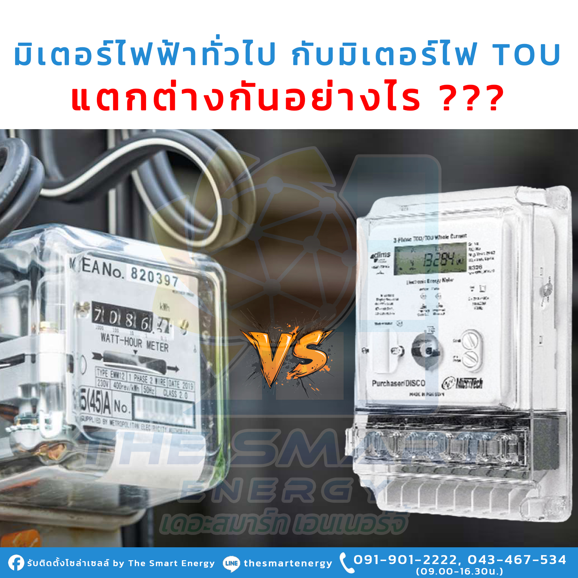1. มิเตอร์ไฟฟ้าทั่วไป. มิเตอร์ไฟฟ้าทั่วไป เป็นระบบมิเตอร์ที่จะมีการคิดค่าบริการ ที่ขึ้นอยู่กับเรทของทางการไฟฟ้าเป็นผู้กำหนด คิดค่าไฟแบบ Progressive rate หรืออัตราก้าวหน้า หมายถึง หากเรามีการใช้งานไฟฟ้าเยอะ ค่าบริการไฟฟ้าต่อหน่วยยิ่งแพงขึ้นตามการใช้งาน แบบที่เราคุ้นเคยกันทั่วไป.2. มิเตอร์ไฟฟ้า แบบ Time of Use Meter หรือ TOU. มิเตอร์ไฟฟ้า แบบ Time of Use Meter หรือ TOU เป็นมิเตอร์ไฟฟ้าที่ออกแบบมาเพื่อคิดค่าไฟฟ้าในอัตราที่แตกต่างกันตามช่วงเวลาการใช้งานในแต่ละช่วง ซึ่งจะแบ่งเป็นช่วงเวลาดังนี้.• On Peak คือ ช่วงเวลาที่มีการใช้งานไฟฟ้าสูงสุด ซึ่งเป็นช่วงเวลาที่มีความต้องการใช้ไฟฟ้าสูง ส่วนใหญ่จะเป็นช่วงกลางวันไปจนถึงดึก เช่น วันจันทร์ – ศุกร์ ช่วงเวลา 00.00 – 22.00 น. ซึ่งจะทำให้อัตราค่าไฟฟ้าสูงตามไปด้วย หากเราหันมาใช้มิเตอร์ TOU ค่าไฟก็จะคิดแบบตามจริง ซึ่งทำให้ไม่ต้องจ่ายค่าไฟแบบเหมารวม.• Off Peak คือ ช่วงเวลาที่มีการใช้งานไฟฟ้าต่ำ ซึ่งเป็นช่วงเวลาที่มีความต้องการใช้ไฟฟ้าน้อย ส่วนใหญ่จะเป็นช่วงเวลาที่นอนหลับ เช่น วันจันทร์ – ศุกร์ ช่วงเวลา 00.00 – 9.00 น. และในวันเสาร์ – อาทิตย์ ช่วงเวลา 00.00 – 24.00 น. ซึ่งจะทำให้อัตราค่าไฟฟ้าลดลง ซึ่งหากเราใช้มิเตอร์ TOU ค่าไฟจะลดลงในช่วงนี้ ทำให้สามารถประหยัดค่าไฟได้อย่างมีประสิทธิภาพ.สรุปคือ การใช้มิเตอร์ TOU จะช่วยลดความต้องการพลังงานไฟฟ้าสูงสุด และเพิ่มประสิทธิภาพการใช้พลังงานโดยรวม โดยการใช้งานมิเตอร์แบบ TOU เหมาะกับคนที่ออกไปทำงานตอนกลางวัน และกลับมาใช้ชีวิตในบ้านตอนกลางคืน รวมถึงวันหยุดเสาร์ – อาทิตย์ เพราะจะช่วยประหยัดไฟได้อย่างมีประสิทธิภาพ เนื่องจากช่วงเวลาที่ใช้ไฟเยอะที่สุด เป็นช่วงเวลา Off Peak ซึ่งเป็นช่วงที่มีอัตราค่าไฟต่ำกว่าช่วง On Peak ซึ่งเป็นช่วงกลางวัน ทำให้ช่วยประหยัดค่าไฟได้ดีกว่ามิเตอร์แบบธรรมดา.โดยทั้งนี้ หากผู้ที่สนใจติดตั้งโซลาร์เซลล์ แต่กำลังลังเลว่า ควรเปลี่ยนมิเตอร์ไฟก่อนดีไหม หรือคิดว่าต้องใช้มิเตอร์แบบใด The Smart Energy พร้อมให้คำปรึกษา และช่วยวางแผนการลดไฟฟ้าเพื่อประหยัดค่าใช้จ่ายให้กับทุกท่าน.บริการดี รวดเร็ว ทันใจ ปลอดภัย ต้อง The Smart Energy .The Smart Energy พร้อมให้คำปรึกษาและดูแลระบบหลังการติดตั้ง- ประสบการณ์มากกว่า 10 ปี- ทีมงานวิศวกรโยธาและวิศวกรรมไฟฟ้า- ที่มีความเชี่ยวชาญ เฉพาะทาง- ผ่านการอบรม และมีใบ Certificate. ปรึกษาฟรีไม่มีค่าใช้จ่ายโทร: 091-901-2222, 043-467-534 (09.00-16.30 น.) เว็บไซต์: www.thesmartde.com Line ID: thesmartenergy หรือกดลิงก์ Line https://line.me/ti/p/RE-UV81ErD E-mail: thesmart_development@yahoo.com.ติดตั้งโซล่าเซลล์กับ The Smart Energy"ลงทุนวันนี้ ประหยัดทันที เพื่ออนาคตที่ยั่งยืน"#ติดตั้งโซล่าเซลล์ #