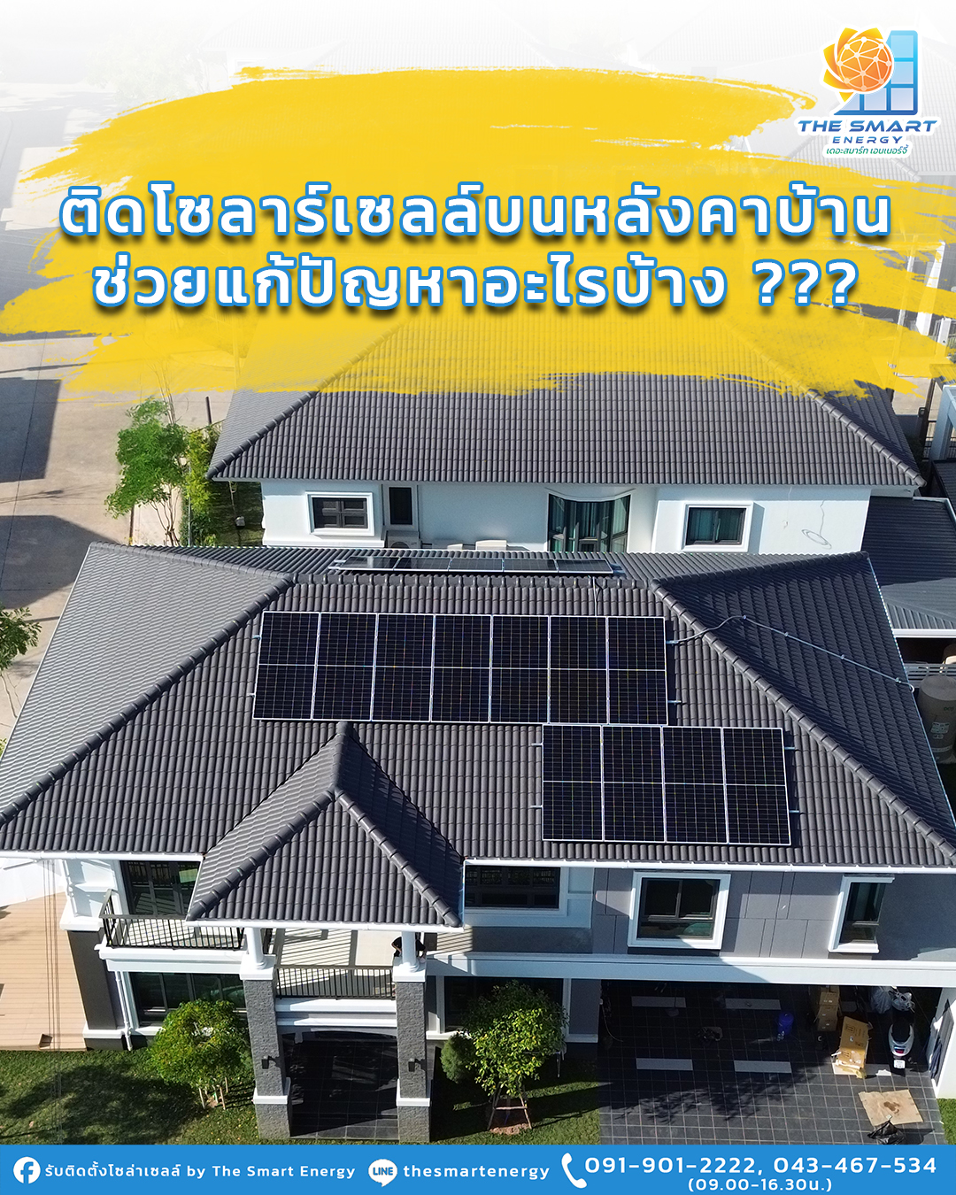 ติดโซลาร์เซลล์บนหลังคาบ้านช่วยแก้ปัญหาอะไรบ้าง ???. รู้หรือไม่ว่าการติดโซลาร์เซลล์มีประโยชน์มากกว่าที่เราคิด เพราะไม่ใช่แค่ตัวเราและครอบครัวได้ประโยชน์เท่านั้น แต่สังคมและสิ่งแวดล้อมยังได้ประโยชน์จากการใช้พลังงานแสงอาทิตย์อีกด้วย เราไปดูกันดีกว่าว่า โซลาร์เซลล์ช่วยแก้ปัญหาอะไรบ้าง.- โซลาร์เซลล์ช่วยแก้ปัญหาอะไรบ้างให้เราและครอบครัวการติดตั้งโซลาร์เซลล์ เป็นหนึ่งในวิธีการช่วยแก้ไขปัญหาเกี่ยวกับระบบไฟฟ้าให้แก่ผู้ที่อยู่อาศัยภายในบ้าน โดยช่วยในเรื่องดังต่อไปนี้.- ลดอุณหภูมิภายในบ้านหลังคาบ้าน เป็นจุดที่นิยมติดตั้งแผงโซลาร์เซลล์มากที่สุด เนื่องจากเป็นจุดที่รับแสงแดดแบบเต็ม ๆ และไม่มีต้นไม้หรือเงาจากบ้านหลังอื่นมาบัง ซึ่งการติดโซลาร์เซลล์บนหลังคา นอกจากจะทำให้ผลิตไฟฟ้าได้อย่างเต็มเม็ดเต็มหน่วยแล้ว ยังช่วยลดแสงอาทิตย์และรังสีความร้อนที่จะเข้ามาสะสมในตัวบ้านอีกด้วย เมื่ออุณหภูมิภายในบ้านลดลง เราก็สามารถลดปริมาณไฟฟ้าที่ใช้ในการปรับอากาศ และช่วยให้บ้านไม่สะสมความร้อนอีกด้วย.- ลดค่าใช้จ่ายค่าไฟฟ้าจุดประสงค์สำคัญของการติดตั้งโซลาร์เซลล์คือการลดค่าใช้จ่ายค่าไฟฟ้า เพราะการติดตั้งโซลาร์เซลล์เป็นการลงทุนติดตั้งระบบครั้งเดียว จากนั้นจะเป็นค่าใช้จ่ายด้านการบำรุงรักษาตามการใช้งาน และด้วยพลังงานแสงอาทิตย์เป็นพลังงานหมุนเวียน จึงไม่มีค่าใช้จ่ายในการซื้อพลังงานอย่างการซื้อน้ำมันดีเซลมาใช้ในการผลิตกระแสไฟฟ้า ทำให้เราลดค่าใช้จ่ายรายเดือนด้านพลังงานไฟฟ้าไปโดยปริยาย.- ลดปัญหาเรื่องไฟตก ไฟดับไฟตก ไฟดับบ่อย ๆ ทำให้เกิดไฟกระชาก ต้นเหตุของเครื่องใช้ไฟฟ้าพังและเสียง่าย อายุการใช้งานสั้นกว่าปกติ การติดตั้งโซลาร์เซลล์เป็นหนึ่งในการช่วยลดปัญหาเรื่องไฟฟ้าขัดข้อง และหากว่าเราติดตั้งเครื่องสำรองไฟบ้านอย่าง Tesla Powerwall เมื่อไฟดับ ระบบจะตัดจ่ายไฟจากแบตเตอรี่เพียงเสี้ยววินาที.- สามารถควบคุมการผลิตและใช้พลังงานไฟฟ้าได้ด้วยตนเองเราสามารถบริหารไฟฟ้าภายในบ้านของเราได้เอง โดยสามารถเซตได้ว่าจะเก็บไฟฟ้าที่ผลิตได้เอาไว้จำนวนเท่าไร จึงจะเพียงพอต่อความต้องการใช้งาน และสามารถ Customized ได้ตามความพึงพอใจ.- โซลาร์เซลล์แก้ปัญหาอะไรบ้างเกี่ยวกับสิ่งแวดล้อม โซลาร์เซลล์ช่วยแก้ปัญหาเรื่องสิ่งแวดล้อมเราต่างรู้กันดีว่า ตอนนี้โลกกำลังเผชิญกับวิกฤตด้านพลังงานและสิ่งแวดล้อม ปริมาณคาร์บอนในชั้นบรรยากาศทำให้โลกร้อนขึ้น ซึ่งพลังงานแสงอาทิตย์เป็นหนึ่งใน Solution ที่ช่วยลดปัญหาดังกล่าวอย่างมี