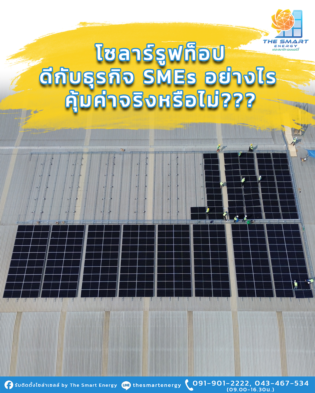 โซลาร์รูฟท็อป ดีกับธุรกิจ SMEs อย่างไร คุ้มค่าจริงหรือไม่ ???. การควบคุมภาระค่าใช้จ่ายเป็นหัวใจสำคัญหนึ่งของการทำธุรกิจให้ประสบความสำเร็จ ซึ่ง “ค่าไฟ” เป็นหนึ่งในค่าใช้จ่ายที่ส่งผลต่อต้นทุนทางธุรกิจอย่างมาก ดังนั้น หนึ่งในวิธีการบริหารค่าใช้จ่ายที่ดีที่สุด คือการเปลี่ยนให้ตัวเราเป็นผู้ควบคุมการผลิตและบริหารจัดการพลังงานไฟฟ้าได้ ด้วยการติดตั้งโซลาร์รูฟท็อป (Solar Rooftop) ลดการพึ่งพาพลังงานไฟฟ้าจากภาครัฐ.- ทำไมโซลาร์รูฟท็อปถึงเหมาะกับ SMEs ไทย. ด้วยปัญหาสิ่งแวดล้อมและการขาดแคลนพลังงานของโลก ทำให้ทั่วโลกหันมาเลือกใช้พลังงานสะอาดกันมากขึ้น ซึ่งพลังงานสะอาดที่กำลังมาแรงคงจะไม่พ้นพลังงานแสงอาทิตย์ ที่มีการพัฒนาแผงโซลาร์เซลล์ให้มีประสิทธิภาพ สามารถผลิตไฟฟ้าได้ปริมาณมากขึ้น และมีอายุการใช้งานที่ยาวนาน คุ้มค่าแก่การลงทุน ประกอบกับอัตราค่าไฟฟ้าที่ดีดตัวสูงขึ้น ทำให้ต้นทุนทางธุรกิจเพิ่มขึ้น ส่งผลให้ภาคธุรกิจหันมามองแหล่งพลังงานทางเลือกอย่างการติดตั้งโซลาร์รูฟท็อป (Solar Rooftop) ที่ลงทุนติดตั้งครั้งเดียว สามารถผลิตพลังงานไฟฟ้าได้ยาวนาน สามารถลดค่าไฟหลักแสน และลดปริมาณคาร์บอนได้หลายสิบตันต่อปี.สำหรับธุรกิจ SMEs ไทย เป็นหนึ่งในธุรกิจที่ขับเคลื่อนเศรษฐกิจของประเทศ ซึ่งการเปลี่ยนมาใช้โซลาร์รูฟท็อป (Solar Rooftop) เหมาะกับ SMEs ด้วยเหตุผลดังต่อไปนี้.เป็นธุรกิจที่มีการใช้ไฟฟ้าจำนวนมากในช่วงเวลากลางวัน การติดตั้งโซลาร์รูฟท็อป (Solar Rooftop) ก็จะช่วยลดค่าใช้จ่ายได้ ไม่ว่าจะเป็นการใช้ไฟสำนักงาน หรือการเดินเครื่องจักรเพื่อผลิตสินค้าสามารถควบคุมและบริหารค่าใช้จ่ายเรื่องไฟฟ้าได้ สามารถจำกัดค่าใช้จ่ายด้านพลังงานที่ต้องจ่าย โดยลดต้นทุนแปรผันที่มีได้ ซึ่งสามารถประหยัดค่าใช้จ่ายด้านพลังงานได้มากถึงหลักแสนต่อปีช่วยดูแลเรื่องสิ่งแวดล้อม ลดปริมาณคาร์บอนฟุตปรินต์ และสามารถนำจุดนี้ไปประชาสัมพันธ์และเป็นจุดขายของสินค้าได้ ซึ่งจากการสำรวจทางการตลาดพบว่า ผู้บริโภคยอมจ่ายเงินมากกว่า เพื่อซื้อสินค้าหรือแบรนด์ที่ใส่ใจเรื่องสิ่งแวดล้อม ขั้นตอนการติดตั้งโซลาร์รูฟท็อปแบบ Step-by-step.- ขั้นตอนการติดตั้งโซลาร์รูฟท็อปแบบ Step-by-stepสำหรับ SMEs ที่สนใจติดตั้งโซลาร์รูฟท็อป (Solar Rooftop) สามารถดำเนินการได้ดังต่อไปนี้.- สำรวจปริมาณการใช้ไฟฟ้าขั้นตอนแรกในการติดโซลาร์รูฟท็อป (Solar Rooftop) เราจะต้องสำรวจปริมาณการใช้ไฟฟ้าของเราก่อนว่าอยู่ที่เท่าไร โดยสามารถตรวจสอบย้อนหลังได้ผ่านใบแจ้งยอดค่าไฟฟ้า หรือในแอปพลิเคชันของการไฟฟ้าที่ให้บริการการสำรวจปริมา