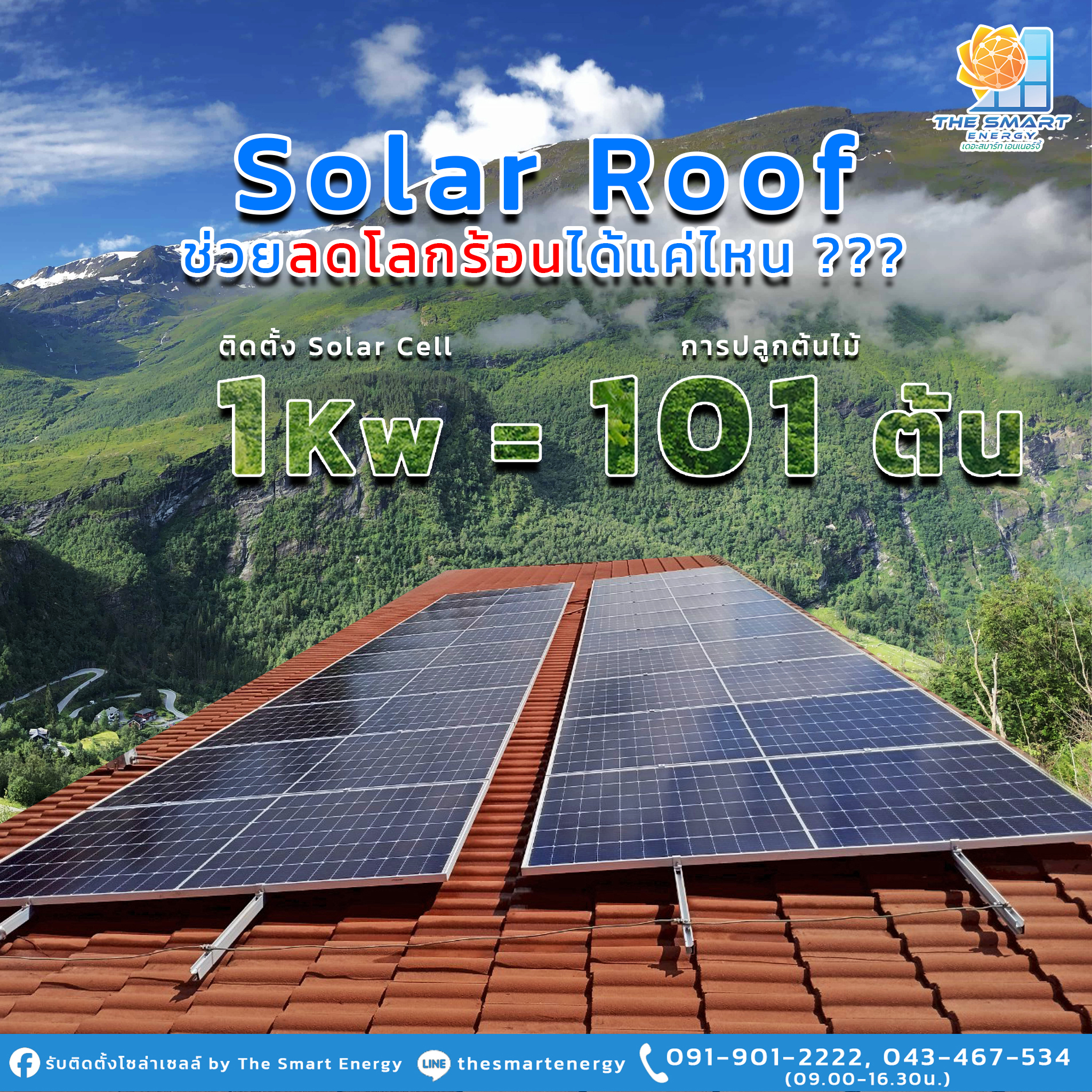 Solar Roof ช่วยลดโลกร้อนได้แค่ไหน ???.. รู้หรือไม่ว่าการติดตั้ง Solar Roof 1 กิโลวัตต์ เปรียบเสมือนการปลูกต้นไม้ 101 ต้น ช่วยลดการปล่อยก๊าซคาร์บอนไดออกไซด์ ได้มากถึง 901.3 กิโลกรัมต่อปี (การปลูกต้นไม้ยืนต้น 1 ต้น สามารถดูดซับก๊าซคาร์บอนไดออกไซด์ได้ประมาณ 8 กิโลกรัมต่อปี).จากสูตรคำนวณการปล่อยก๊าซคาร์บอนไดออกไซด์ Solar Cell 1 กิโลวัตต์ (ขนาดแผงโซลาร์ 120 X 60 เซนติเมตร จำนวน 10 แผง)ผลิตไฟฟ้าได้ 1,300 kWh/yr (หน่วยต่อปี)= 1,300 kWh x 0.6933 kgCO2e/kWh= 901.3 kgCO2e.แล้วทำไม Solar Roof ถึงช่วยลดโลกร้อนได้?. การผลิตไฟฟ้าจากแสงอาทิตย์ ไม่ก่อให้เกิดมลพิษหรือปล่อยก๊าซคาร์บอนไดออกไซด์เปรียบเสมือนการเพิ่มพื้นที่สีเขียว ช่วยดูดซับก๊าซคาร์บอนไดออกไซด์ ลดการปล่อยก๊าซคาร์บอน: แทนที่ไฟฟ้าจากโรงไฟฟ้าที่ปล่อยก๊าซคาร์บอน Solar Roof ช่วยลดการปล่อยก๊าซเรือนกระจก .เปลี่ยนมาใช้พลังงานสะอาด ลดโลกร้อน ร่วมสร้างอนาคตที่ยั่งยืน….อ้างอิง: สถาบันวิจัยพลังงาน จุฬาลงกรณ์มหาวิทยาลัย.บริการดี รวดเร็ว ทันใจ ปลอดภัย ต้อง The Smart Energy .The Smart Energy พร้อมให้คำปรึกษาและดูแลระบบหลังการติดตั้ง- ประสบการณ์มากกว่า 10 ปี- ทีมงานวิศวกรโยธาและวิศวกรรมไฟฟ้า- ที่มีความเชี่ยวชาญ เฉพาะทาง- ผ่านการอบรม และมีใบ Certificate. ปรึกษาฟรีไม่มีค่าใช้จ่ายโทร: 091-901-2222, 043-467-534 (09.00-16.30 น.) เว็บไซต์: www.thesmartde.com Line ID: thesmartenergy หรือกดลิงก์ Line https://line.me/ti/p/RE-UV81ErD E-mail: thesmart_development@yahoo.com.ติดตั้งโซล่าเซลล์กับ The Smart Energy"ลงทุนวันนี้ ประหยัดทันที เพื่ออนาคตที่ยั่งยืน"#ติดตั้งโซล่าเซลล์ #ติดตั้งโซล่าเซลล์ขอนแก่น #ขอนแก่น #Solarcell #Solar