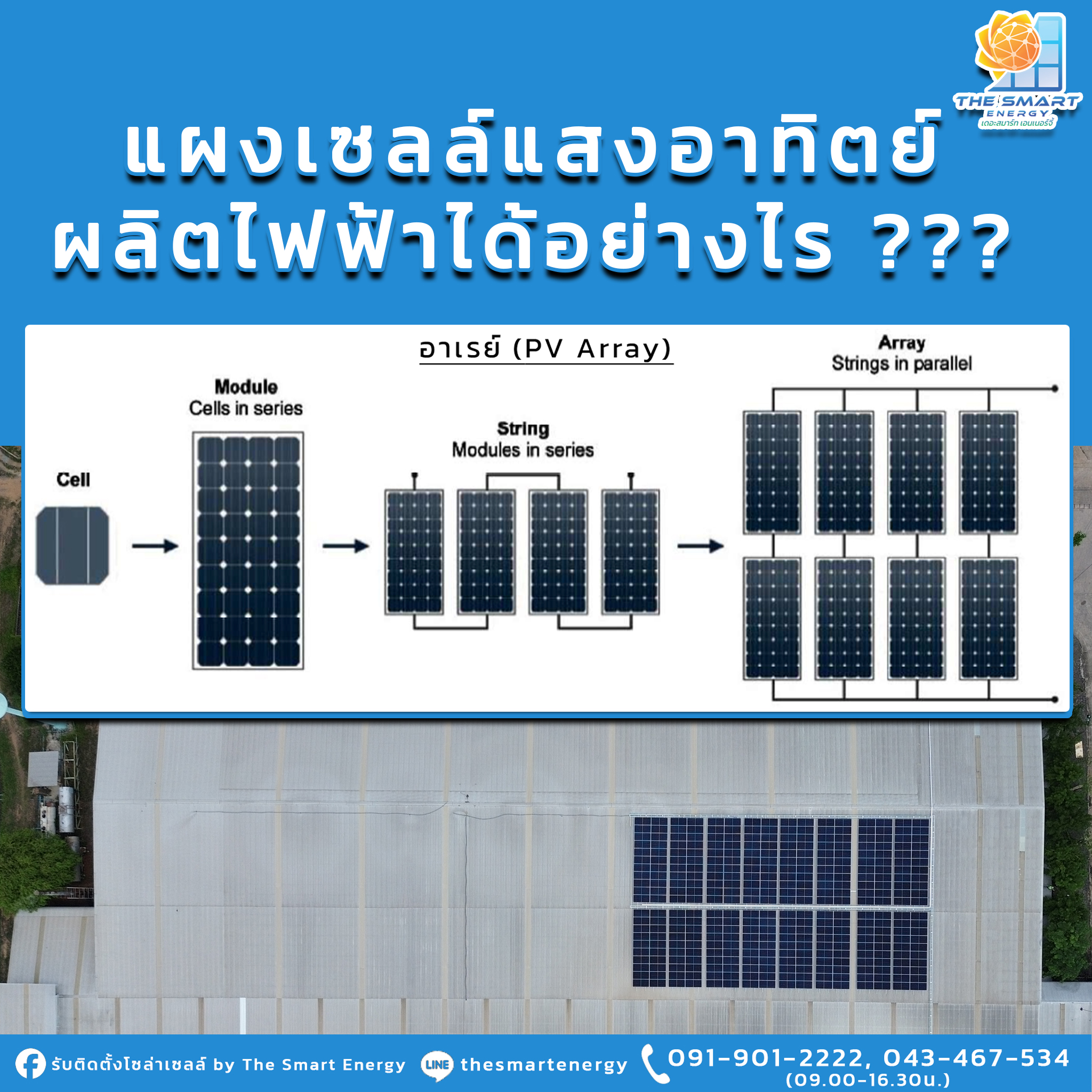 แผงเซลล์แสงอาทิตย์ ผลิตไฟฟ้าได้อย่างไร ???.. เซลล์แสงอาทิตย์หรือ โซล่าเซลล์ (solar cell) หรือ เซลล์โฟโตโวลตาอิก (photovoltaic cell, PV cell) คือ อุปกรณ์ทางไฟฟ้าทำจากสารกึ่งตัวนำทำหน้าที่เปลี่ยนพลังงานแสงหรือโฟตอนเป็นพลังงานไฟฟ้าโดยตรง โดยอาศัยกระบวนการโฟโตโวลตาอิก (photovoltaic effect) ซึ่งเกิดจากความต่างศักย์ไฟฟ้าภายในสารกึ่งตัวนำมีค่าแตกต่างกัน เมื่อได้รับแสงที่มีพลังงานมากพอ ทำให้เกิดการเคลื่อนที่ของอิเล็กตรอนอิสระ และเกิด เป็นกระแสไฟฟ้า และเมื่อต่อโหลดให้ จะทำให้เกิดกระแสไฟฟ้าไหลผ่านโหลดนั้นได้ โดยทั่วไปทำจากสารกึ่งตัวนำชนิดพิเศษ(Sillicon)ที่มีคุณสมบัติในการเปลี่ยนพลังงานแสงอาทิตย์ให้เป็นพลังงานไฟฟ้าโดยกระแสไฟฟ้าที่ผลิตได้จากโซล่าเซลล์นั้นจะเป็นไฟฟ้ากระแสตรง (DC:Direct Current).. แผงเซลล์แสงอาทิตย์(solar panel หรือ solar module) หรือที่เรียกในภาษาอังกฤษว่า photovoltaics module (PV module) หมายถึงการนำเอาเซลล์แสงอาทิตย์จำนวนหลายๆเซลล์ มาต่อวงจรรวมกันอยู่ในแผงเดียวกันเพื่อความสะดวกในการนำไปใช้งานและสามารถผลิตและจ่ายกระแสไฟฟ้าได้มากขึ้น โดยไฟฟ้าที่ได้นั้นเป็นไฟฟ้ากระแสตรง (Direct Current, DC) ลักษณะของแผงเซลล์ ประกอบด้วยด้านหน้าเป็นแผ่นกระจกใส ซึ่งมีคุณสมบัติในการยอมให้แสงผ่านได้ดี และยังเป็นเกราะป้องกันแผ่นเซลล์อีกด้วยด้านในเป็นแผ่นเซลล์แสงอาทิตย์หลายแผ่นต่อเรียงกัน อาจจะมีสีฟ้าเข้มหรือ สีดำแล้วแต่ชนิดของเซลล์แสงอาทิตย์ที่มาทำแผง ขนาดใหญ่เล็กแตกต่างกันไปแล้วแต่ขนาดของกำลังไฟฟ้า(วัตต์) ที่ผลิตได้ ภายนอกขอบเป็นโลหะหรืออลูมิเนียมแข็งแรง ไว้สำหรับยึดกับตัวจับที่ใช้สำหรับที่ต่างๆ เช่นหลังคาบ้าน หรือโครงเหล็กที่ติดตั้งบนพื้นดินได้.. โดยในแผงเซลล์แสงอาทิตย์แต่ละแผง หากนำมาเชื่อมต่ออนุกรมกันเพื่อเพิ่มแรงดันไฟฟ้าจะเรียกว่า สตริง (PV String) และหลายๆสตริงมาต่อขนานกันหลายๆแถวเพื่อเพิ่มกระแสจะเรียกว่า อาเรย์ (PV Array) ดังรูป.บริการดี รวดเร็ว ทันใจ ปลอดภัย ต้อง The Smart Energy .The Smart Energy พร้อมให้คำปรึกษาและดูแลระบบหลังการติดตั้ง- ประสบการณ์มากกว่า 10 ปี- ทีมงานวิศวกรโยธาและวิศวกรรมไฟฟ้า- ที่มีความเชี่ยวชาญ เฉพาะทาง- ผ่านการอบรม และมีใบ Certificate. ปรึกษาฟรีไม่มีค่าใช้จ่ายโทร: 091-901-2222, 043-467-534 (09.00-16.30 น.) เว็บไซต์: www.thesmartde.com Line ID: thesmartenergy หรือกดลิงก์ Line https://line.me/ti/p/RE-UV81ErD E-mail: thesmart_development@yahoo.com.ติดตั้งโซล่าเซลล์กับ The Smart Energy"ลงทุนวันนี้ ประหยัดทันที เพื่ออนาคตที่ยั่งยืน"#ติดตั้งโซล่าเซลล์ #ติดตั้งโซล่าเซลล์ขอนแก่น #ขอนแก่น #Solarcell #Solar