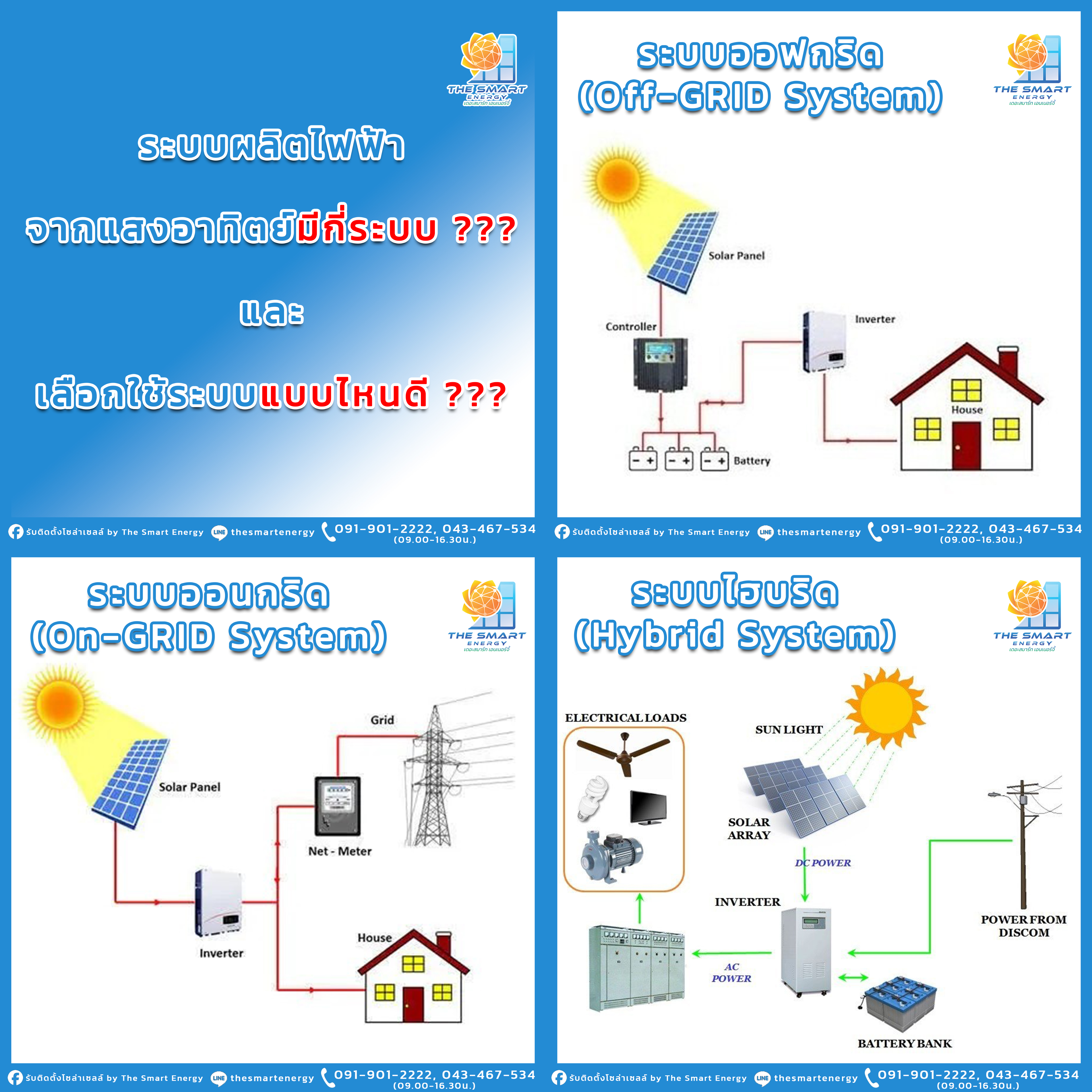 ระบบผลิตไฟฟ้าจากแสงอาทิตย์มีกี่ระบบ ??? เลือกใช้ระบบแบบไหนดี ???..ระบบการผลิตกระแสไฟฟ้าจากเซลล์แสงอาทิตย์ โดยทั่วไปแบ่งเป็น 3 ระบบ.. 1. ระบบผลิตไฟฟ้าด้วยเซลล์แสงอาทิตย์แบบอิสระ (Stand Alone System) หรือ ระบบออฟกริด (Off-GRID System) คือระบบที่ไม่เชื่อมต่อกับระบบไฟฟ้าของการไฟฟ้า เหมาะสำหรับพื้นที่ที่ไม่มีไฟฟ้าจากภาครัฐเข้าถึงเช่น บนป่าเขา หรือไร่นา(ชุดนอนนา) ระบบนี้จะมีอุปกรณ์ประกอบมากกว่าระบบออนกริด (On-GRID SYSTEM) และมีราคาสูงกว่า อีกทั้งมีเสถียรภาพต่ำกว่า แต่ดีที่ขณะไฟฟ้าดับก็มีไฟฟ้าจากแบตเตอรี่มาใช้ประโยชน์ได้ แต่ต้องติดตั้งขนาดแบตเตอรี่ให้เหมาะสมกับการใช้งาน และระบบนี้ไม่ต้องขออนุญาติจากการไฟฟ้าเพราะไม่ได้ซื้อไฟฟ้าจากการไฟฟ้า โดยมีส่วนประกอบหลักดังนี้. 1.1 แผงเซลล์แสงอาทิตย์ หรือแผง PV. 1.2 อุปกรณ์ควบคุมการประจุ (Charge Controller). 1.3 แบตเตอรี่ (Battery). 1.4 อินเวอเตอร์ (Inverter) ถ้าใช้กระแสตรงก็ไม่ต้องมีอินเวอเตอร์.. 2. ระบบผลิตไฟฟ้าด้วยเซลล์แสงอาทิตย์แบบเชื่อมต่อกับระบบจำหน่าย (Grid Connected System) หรือระบบออนกริด (On-GRID System) คือระบบที่เชื่อมขนานกับระบบไฟฟ้าภาครัฐ ซึ่งต่างจากระบบ (Off-GRID) ที่ไม่มีแบตเตอรี่เพื่อเก็บไฟฟ้าส่วนเกิน ทำให้ราคาถูกกว่า ระบบออฟกริด (Off-GRID System) มีการใช้และบำรุงรักษาง่ายกว่า และมีเถียรภาพดีเนื่องจากมีการใช้ไฟฟ้าจากการไฟฟ้าร่วมด้วย แต่เมื่อไฟฟ้าของการไฟฟ้าดับผู้ใช้ก็จะดับด้วยเพราะไม่มีแบตเตอรี่สำรองไฟฟ้า เหมาะกับการใช้ไฟฟ้าในช่วงกลางวัน โดยมีส่วนประกอบหลักดังนี้. 1.1 แผงเซลล์แสงอาทิตย์ หรือแผง PV. 1.2 อินเวอเตอร์ (Inverter) ต้องได้รับการรับรองจากการไฟฟ้า.. 3. ระบบผลิตไฟฟ้าด้วยเซลล์แสงอาทิตย์แบบผสมผสาน หรือระบบไฮบริด (Hybrid System) คือการผสมกันระหว่าง On-GRID และ Off-GRID โดยระบบนี้จะมีการเชื่อมต่อกับการไฟฟ้าสำหรับช่วงที่ไม่มีแดดและมีการใช้แบตเตอรี่เพื่อเก็บพลังงานส่วนที่ผลิตเหลือในตอนกลางวันไปใช้งานในตอนกลางคืน ทำให้มีส่วนประกอบมาก ราคาสูง ระยะเวลาคืนทุนนาน แต่เสถียรภาพในการใช้ดี ถ้ามีการใช้ไฟฟ้าในช่วงกลางวันน้อยกว่ากลางคืน เหมาะกับการใช้ไฟฟ้าทั้งกลางวันและกลางคืน โดยจะต้องออกแบบขนาดให้มีไฟฟ้าเหลือเก็บไว้ในแบตเตอรี่ให้เพียงพอกับการใช้ไฟฟ้าในช่วงเวลากลางคืน ถ้าไม่มีไฟฟ้าเหลือในแบตเตอรี่ก็ไม่จำเป็นต้องใช้ระบบนี้ นอกจากนั้นถ้าไม่ใช้แบตเตอรี่ก็สามารถต่อร่วมกับระบบผลิตไฟฟ้าจากลมหรือน้ำหรือ Generator ก็ได้.บริการดี รวดเร็ว ทันใจ ปลอดภัย ต้อง The Smart Energy 😊.💙The Smart Energy พร้อมให้คำปรึกษาและดูแลระบบหลังการติดตั้ง- ประสบการณ์มากกว่า 10 ปี- ทีมงานวิศวกรโยธาและวิศวกรรมไฟฟ้า- 