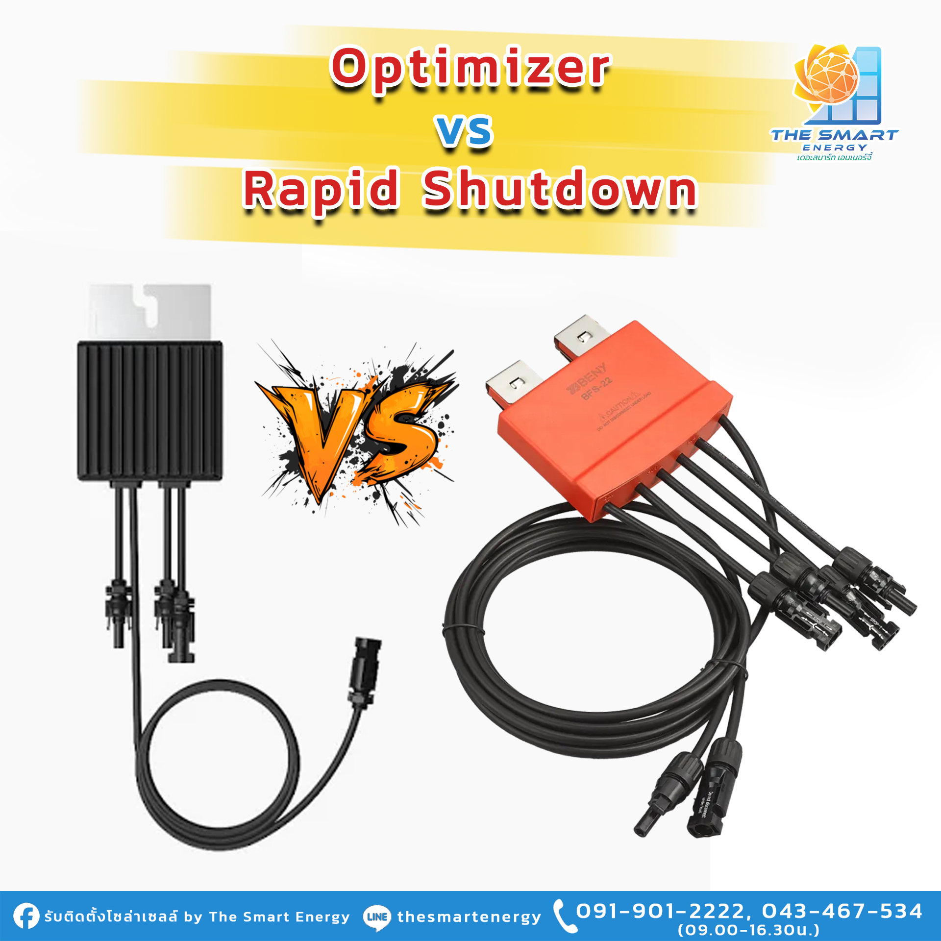 Optimizer vs Rapid Shutdown. ในระบบโซลาร์เซลล์ (Solar Energy System) เทคโนโลยีทั้งสองอย่าง ได้แก่ optimizer และ rapid shutdown มีบทบาทที่สำคัญในการทำงานของระบบพลังงานแสงอาทิตย์ แต่ทั้งสองมีวัตถุประสงค์และฟังก์ชันที่เหมือนกัน เราจะมาอธิบายความแตกต่างระหว่างทั้งสองและความสำคัญของแต่ละเทคโนโลยี.ความแตกต่างระหว่าง Optimizer และ Rapid Shutdown.- วัตถุประสงค์. Optimizer เพิ่มประสิทธิภาพการผลิตพลังงานจากแผงโซลาร์. Rapid Shutdownความปลอดภัยในการลดแรงดันไฟฟ้าในกรณีฉุกเฉิน.- การทำงาน. Optimizer ปรับแต่งประสิทธิภาพแผงโซลาร์แต่ละแผง. Rapid Shutdownลดแรงดันไฟฟ้าให้เป็นระดับปลอดภัยในกรณีฉุกเฉิน.- ความสำคัญ. Optimizer การเพิ่มประสิทธิภาพในการผลิตพลังงาน. Rapid Shutdownความปลอดภัยและการปฏิบัติตามกฎหมาย.- การติดตั้ง. Optimizer ติดตั้งเพื่อเพิ่มประสิทธิภาพการทำงานของแผง. Rapid Shutdownติดตั้งเพื่อให้ระบบปลอดภัยในกรณีฉุกเฉิน.*** ข้อสรุป ***. Optimizer เหมือนกับ Rapid Shutdown เพียงแต่มี option ต่างๆ ที่มากกว่าและเป็นส่วนสำคัญที่ช่วยให้ระบบพลังงานแสงอาทิตย์มีประสิทธิภาพและความปลอดภัยที่สูงขึ้น